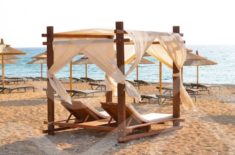 Dit is onze favoriet. Een mooi zandstrand met ligbedjes en grote loungebedden. Ook is er een strandtentje voor een hapje en een drankje. Vlakbij dit strand kun je gratis parkeren. Soms wel een beetje hectisch op de smalle wegen er naar toe. Wij gaan liever met de fiets. Via een houten loopbrug kunt u richting het strand wandelen. Het strand ligt vlakbij een groot blauw hotel (Hotel Poseidon), dit kunt u als herkenningspunt gebruiken. Dit strand is door velen geroemd.